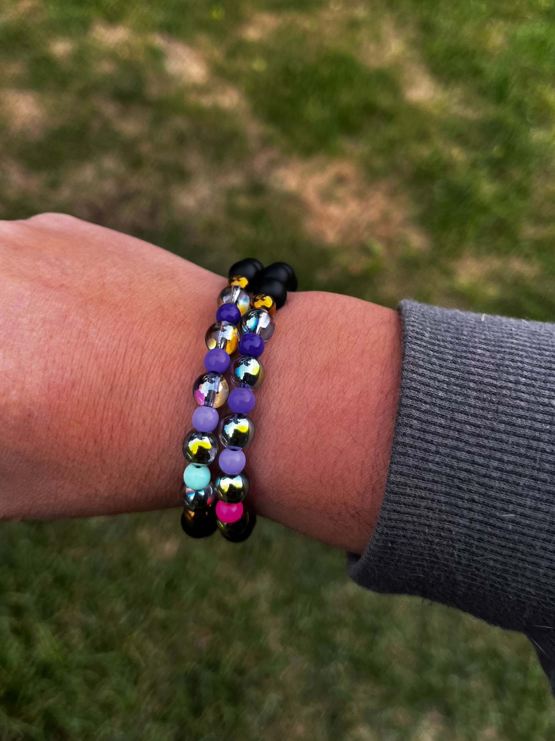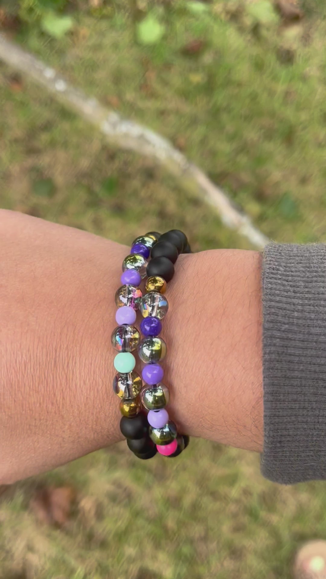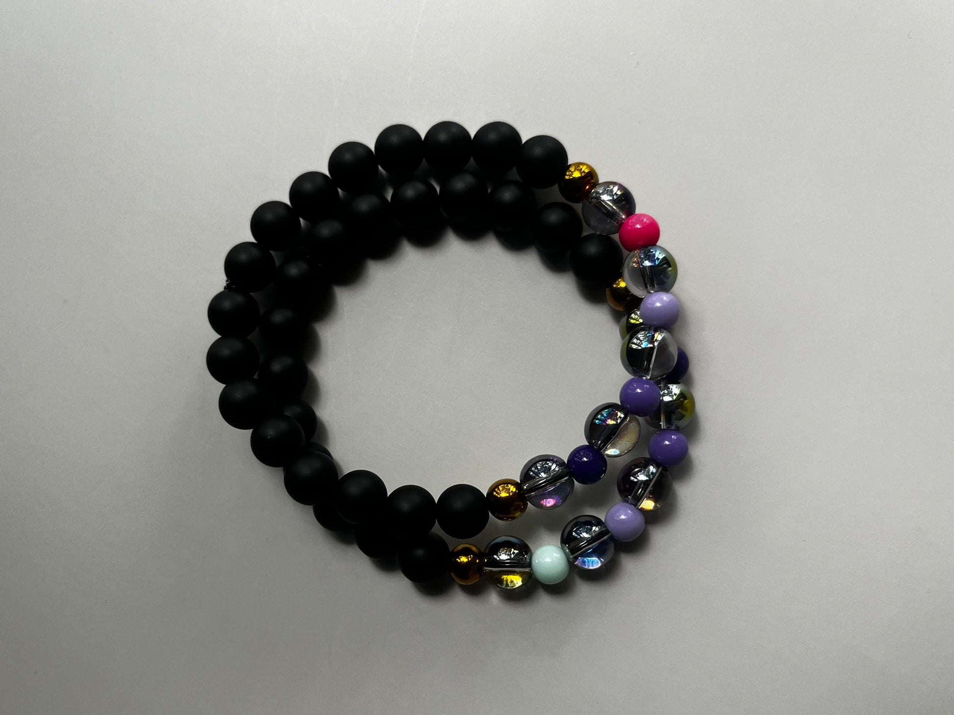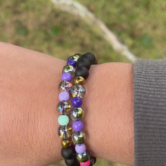 8mm matte black onyx | gold hematite | glass iridescent beads | purple + pink or purple + green acrylic beads