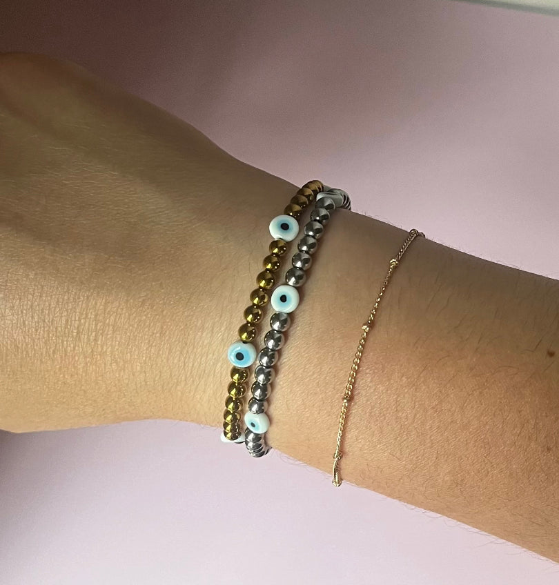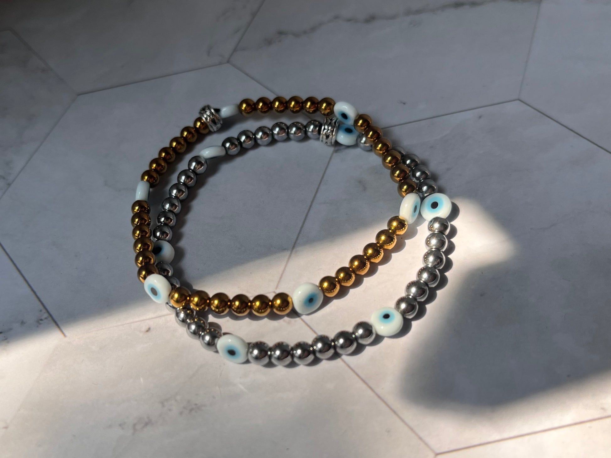 The Athena Bracelet is a boho-chic staple featuring both gold and silver hematite beads, with evil eyes for added protection. Handcrafted for daily wear and intention, this piece blends ancient symbolism with modern style.