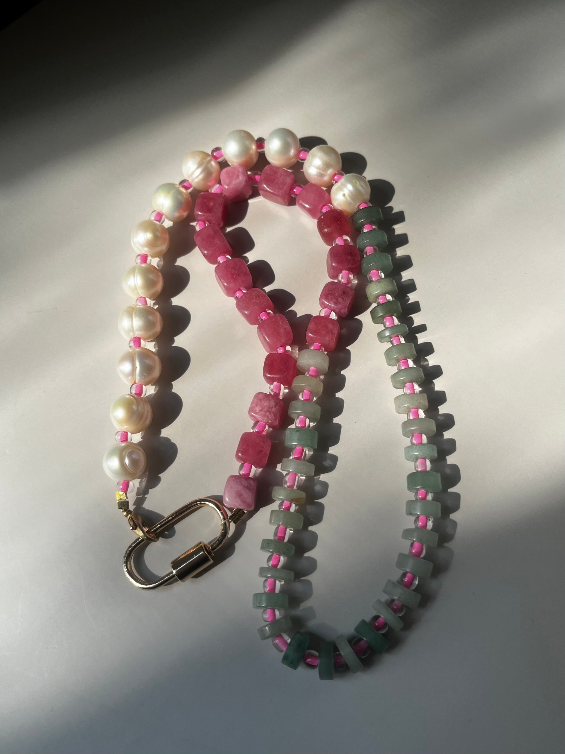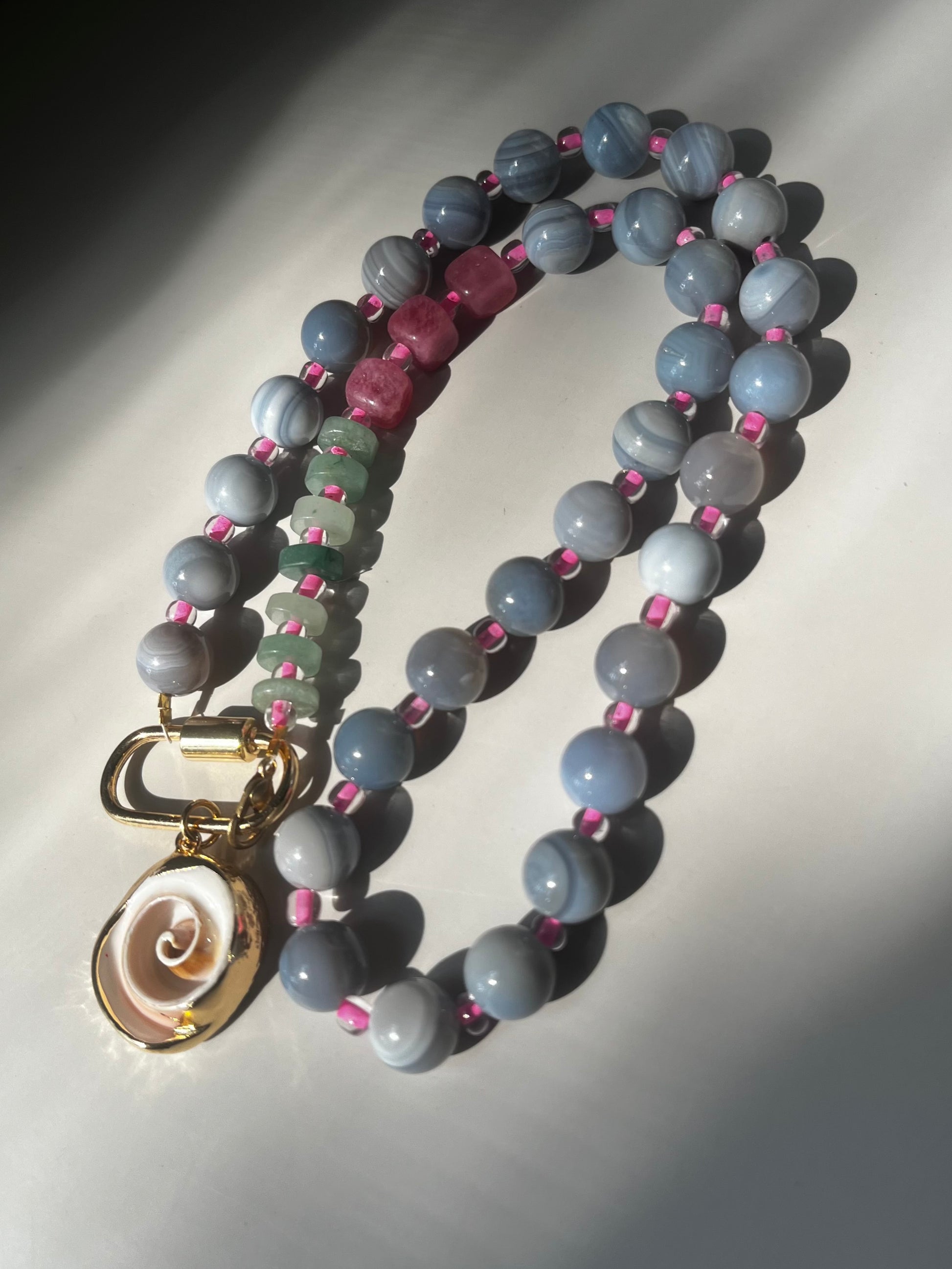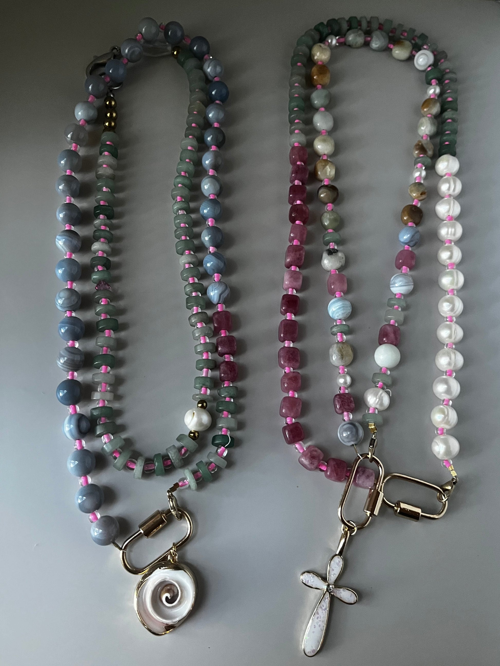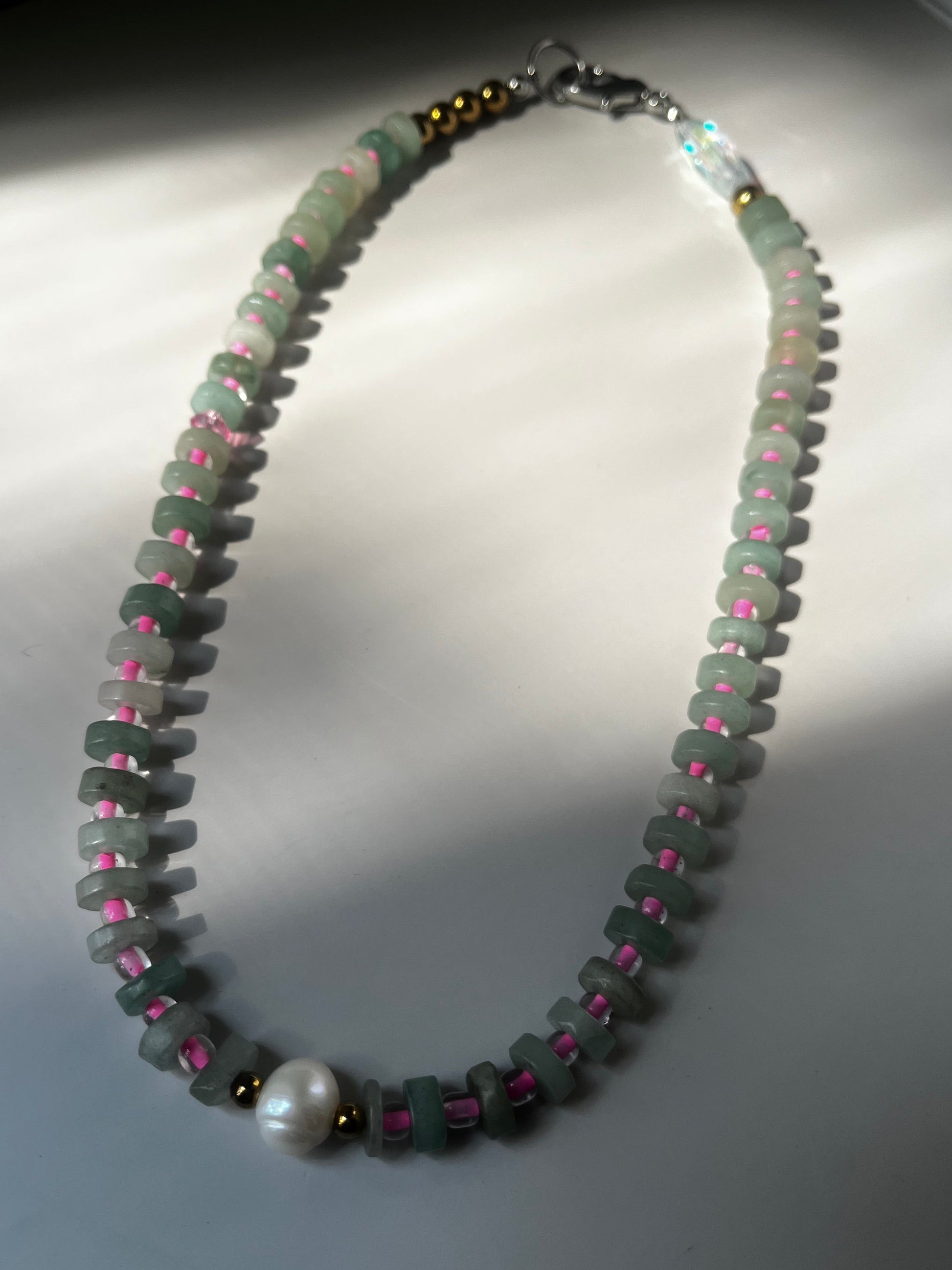 Stepย into a world where earth meets sky. The Celestial Garden Collection is inspired by the harmony of nature and the cosmos, blending deep pink, tranquil blue, and grounding green aventurine beads into wearable works of art. Each necklace is a reflection of balance - blooming like a garden under the starlight.