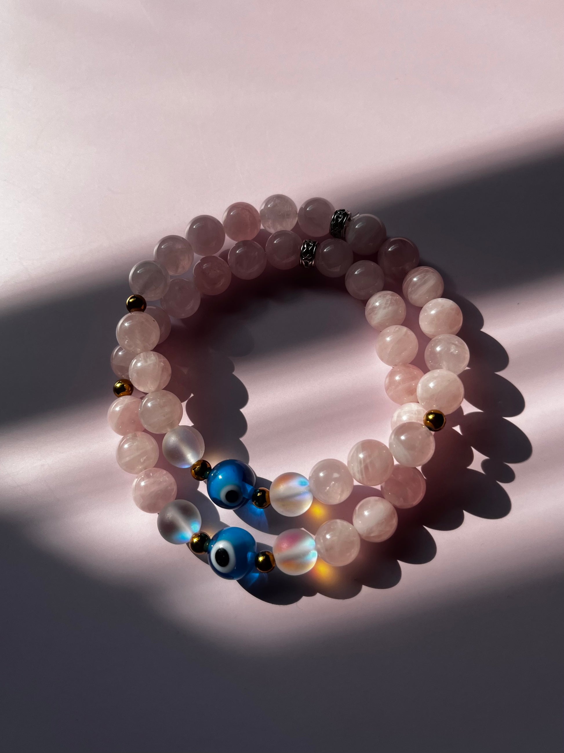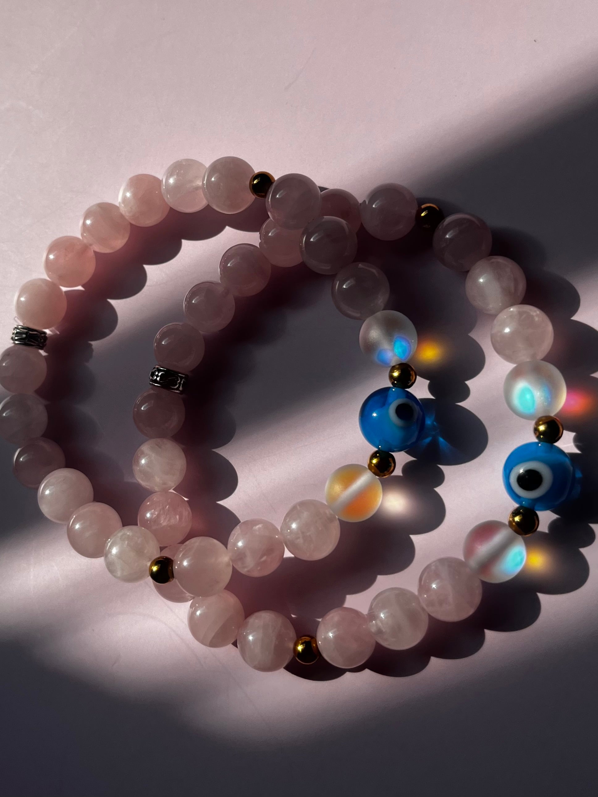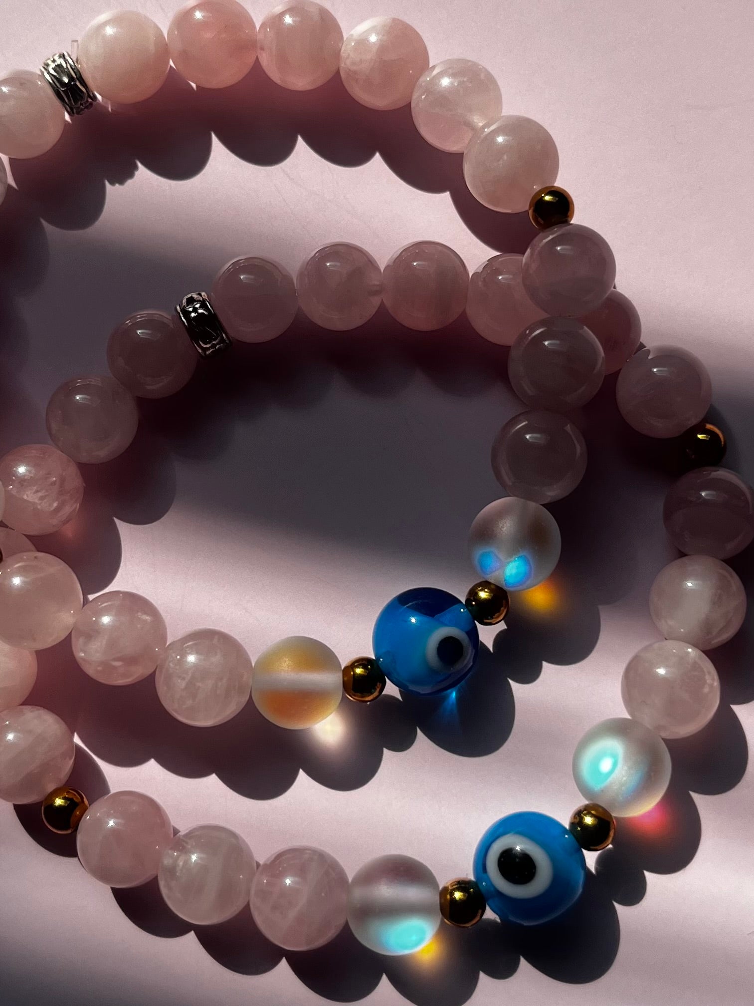 8mm Grade AAA Madagascar Rose Quartz | Gold hematite | Blue glass blown evil eye