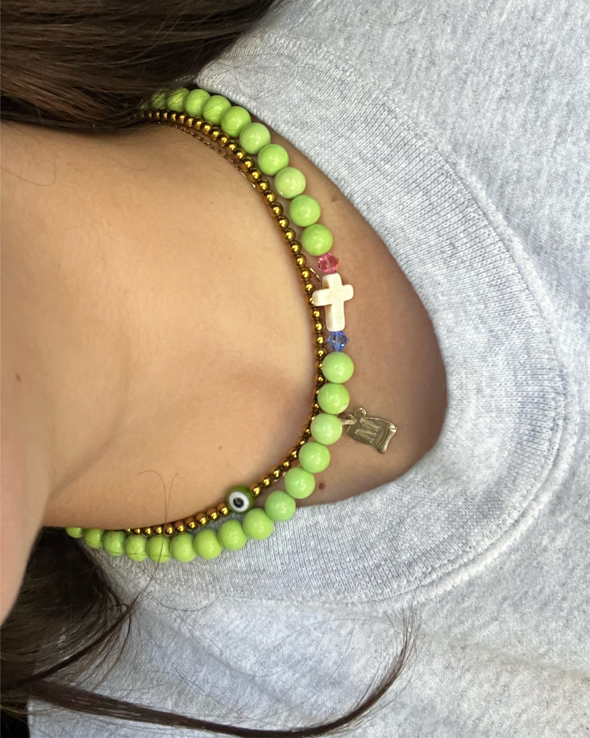 Lime green howlite | semi precious stone cross | pink + blue Swarovski crystals